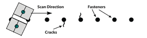 If two cracks in opposite sides of the fastener hole are present with the probe moving at right angles and centralized over the fastener the indications will typically add up to a larger indication. This is because both are being detected at the same time (with a fixed probe they would normally be detected one after the other in a 0° scan).