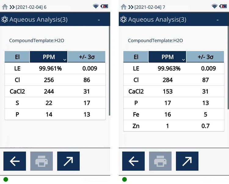 Abbildung 3: Inline-Berechnung des Vanta RFA-Handanalysators von Calciumchlorid (CaCl2) im Quellwasser (links) und Leitungswasser (rechts)