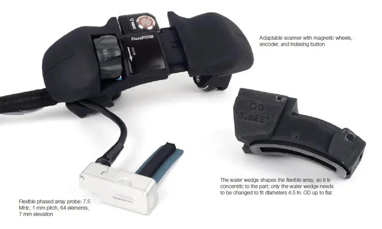 Die FlexoFORM Lösung besteht aus drei Hauptkomponenten: einem flexiblen Phased-Array-Sensor, Wasserstreckenvorlaufkeilen für die Tauchtechnik und einem Scanner für eine stabile Positionierung auf der Prüfteiloberfläche.