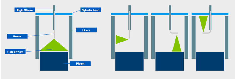 Instrumentierung und Altölanalyse sind nicht invasive Methoden, die den Betrieb des Hubkolben-Verbrennungsmotors nicht unterbrechen und allgemein als erster Schritt bei der Zustandsüberwachung angesehen werden. Da diese Methoden jedoch nur begrenzt Informationen liefern, kann eine regelmäßige Sichtprüfung mit einem Endoskop erforderlich sein, entweder als Teil einer vorbeugenden Wartungsstrategie oder als Hilfsmittel bei der reaktiven Wartung. Hauptsächlich wird bei der Sichtprüfung mit einem Videoskop eines Hubkolben-Verbrennungsmotors der Verbrennungsraum, auch als Zylinder bezeichnet, geprüft. Die Komponenten rund um den Brennraum sind hohem Druck und hohen Temperaturen ausgesetzt und müssen daher auf Beschädigungen und Verschleiß überprüft werden. Neben dem Zylinder können auch andere Motorteile mit dem Endoskop geprüft werden, wie Wassermantel, Ölkanäle, Ölwanne, Turbolader, Kühl- und Lüftungssysteme und Lichtmaschine.