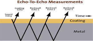 Bei der Echo-Echo-Dickenmessung wird auf die bewährte Technik der Messung des Zeitintervalls zwischen zwei aufeinanderfolgenden Rückwandechos der Schallwelle durch das Testmaterial zurückgegriffen. Bei lackiertem Metall treten diese mehrfachen Rückwandechos nur im Metall und nicht in der Beschichtung auf, sodass das Intervall zwischen zwei Rückwandechos (Rückwandecho 1 und 2 oder Rückwandecho 2 und 3 usw.) nur die Metalldicke repräsentiert und die Beschichtungsdicke außer Acht lässt.
