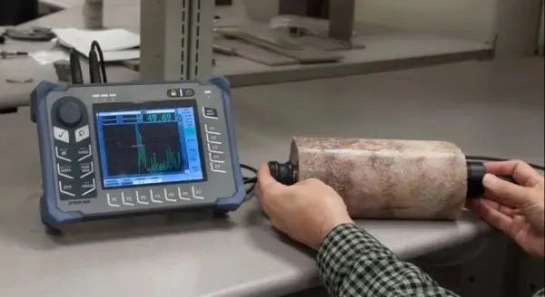 Aufbereitete geologische Proben können normalerweise mit Ultraschallprüfgeräten, wie dem EPOCH 650 Prüfgerät von Evident, geprüft werden. Niederfrequente Schallkopfkopfpaare werden im Modus für Longitudinalwellen und Transversalwellen eingesetzt. Die je nach Prüfung verwendeten spezifischen Schallköpfe hängen von den akustischen Eigenschaften der Prüfmaterialien und den Probenabmessungen ab. Am häufigsten werden jedoch Frequenzen von 1 MHz und weniger verwendet. Die Frequenz sollte so gewählt werden, dass neben einer ausreichenden Durchdringung auch unverzerrte Wellenformen erreicht werden.