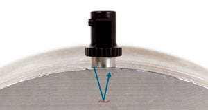 Zur Prüfung unter der Oberfläche wird ein Sender/Empfänger-Prüfkopf für konventionellen Ultraschall eingesetzt, der die Tote Zone nahe der Oberfläche minimiert.