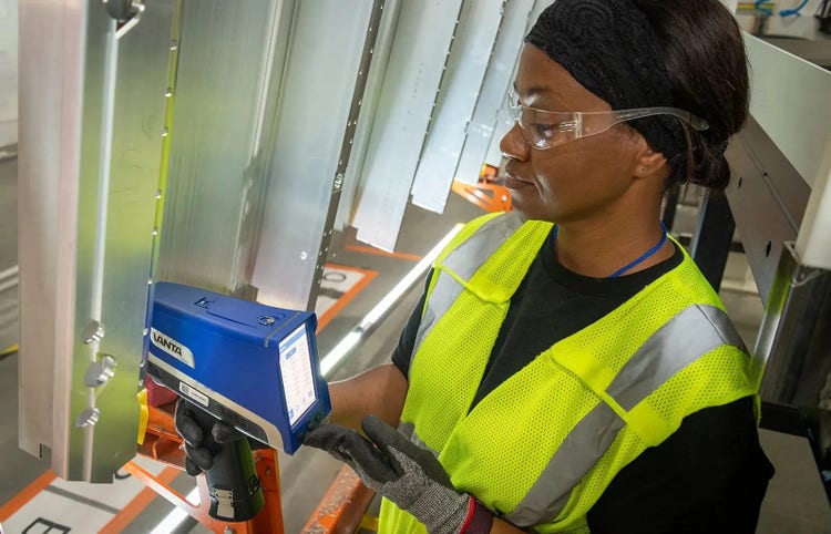 Technische Fachkraft mit einem RFA-Handanalysator bei einer Beschichtungsanalyse.