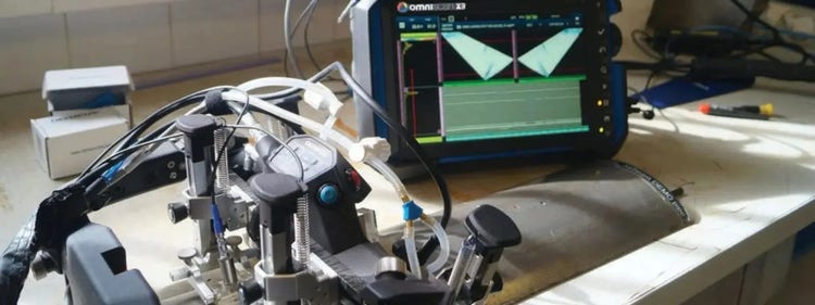 AxSEAM Scanner und OmniScan X3 Prüfgerät auf einem Rohrabschnitt mit simulierten Defekten nach Widerstandsschweißen im Testlabor von Onet Technologies (Bildquelle: CEM Zeitschrift)