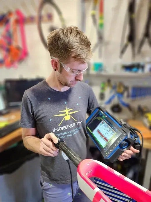 Shawn Small: Vor ungefähr 8 oder 9 Jahren habe ich angefangen die Prüftechniken für Verbundwerkstoffe auszuprobieren, um zu sehen, was überhaupt möglich ist, und so bin ich schließlich beim Ultraschall gelandet. Zu diesem Zeitpunkt hatten wir mit Blitzthermografie und Laser-Shearing-Interferometrie sowie allen möglichen Hybridlösungen experimentiert, aber ich wollte eine endgültige Lösung. Und meines Erachtens ist Ultraschall wirklich die einzige konsistente Methode.