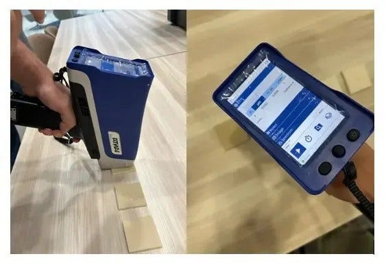 Ein Techniker misst die Dicke der Yttrium-Beschichtung mit einem Vanta RFA-Handanalysator.