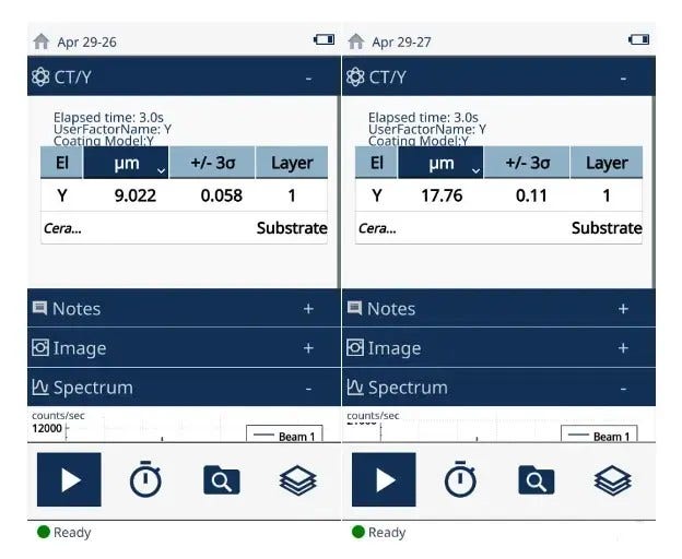Diese Methode ist zudem noch einfach. Der Analysator sendet Röntgenstrahlung, die auf das Prüfobjekt treffen und es zum Fluoreszieren anregen. Der Analysator erkennt die zurückkommenden Röntgenstrahlen und berechnet anhand der Daten die Dicke der Yttrium-Beschichtung (Y). So erhalten Sie in Sekundenschnelle Ergebnisse zur Dickenmessung. In unserem Blogartikel Durch dick und dünn: RFA für die Messung der Beschichtungsdicke erfahren Sie mehr über die Beschichtungsmessung.