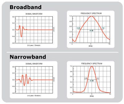 Bandbreite: Typische Messköpfe zur Dickenmessung erzeugen keine Schallwellen mit einer einzigen reinen Frequenz, sondern über einen Frequenzbereich, der bei der Nennfrequenz zentriert ist. Bandbreite ist der Frequenzbereich innerhalb festgelegter Amplitudengrenzen. Eine große Bandbreite ist normalerweise bei Dickenmessanwendungen empfehlenswert, wenn Kontakt-, Vorlaufstrecken- und Tauchtechnik-Messköpfe verwendet werden.