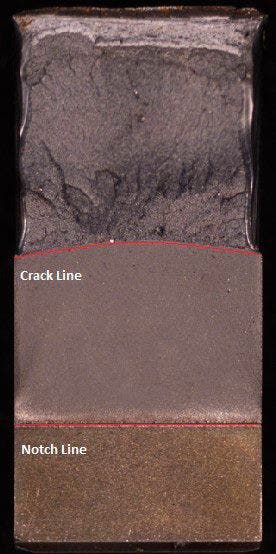 To initiate fatigue cracking for the test, cyclic loading was applied to the SENB specimen with the loading concentrated on the center roller over the starter notch. The loads were applied at a range of 5 to 10 hertz, based on the force that the engineers calculated was required to generate the desired fatigue crack growth without causing unwanted deformation.