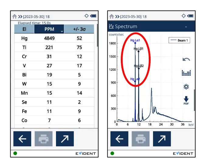 Figure 1 to Figure 3 shows the test results from a Vanta™ handheld XRF analyzer for various cosmetic products. Notably, the Vanta analyzer can analyze mercury concentrations as low as 10 ppm.