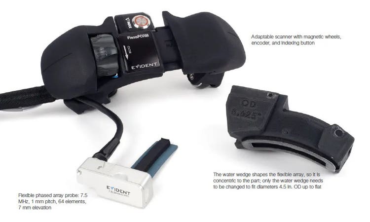 The FlexoFORM solution is comprised of three components: a flexible phased array probe, local-immersion water wedges (for a wide range of pipe diameters), and a scanner that provides stability and positioning information in relation to the part’s surface.