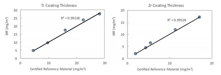 The data above shows excellent correlation between the results obtained using a Vanta™ handheld XRF analyzer and the coating thickness reference materials for titanium (Ti) and zirconium (Zr).