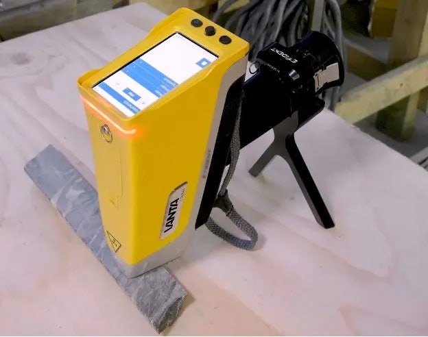 The Vanta handheld XRF analyzer measures the elemental chemistry of drill core on-site. The Vanta Soil Foot provides a stable three-point support for the analyzer, enabling the operator to perform a comfortable hands-free analysis.