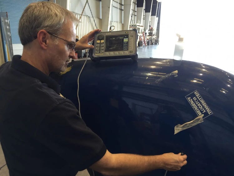 An operator uses the BondMaster 600 bond tester in resonance mode to inspect composite material.