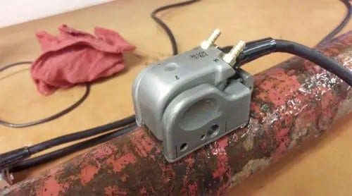 DLA probe being used to inspect a piece of flow iron for corrosion.