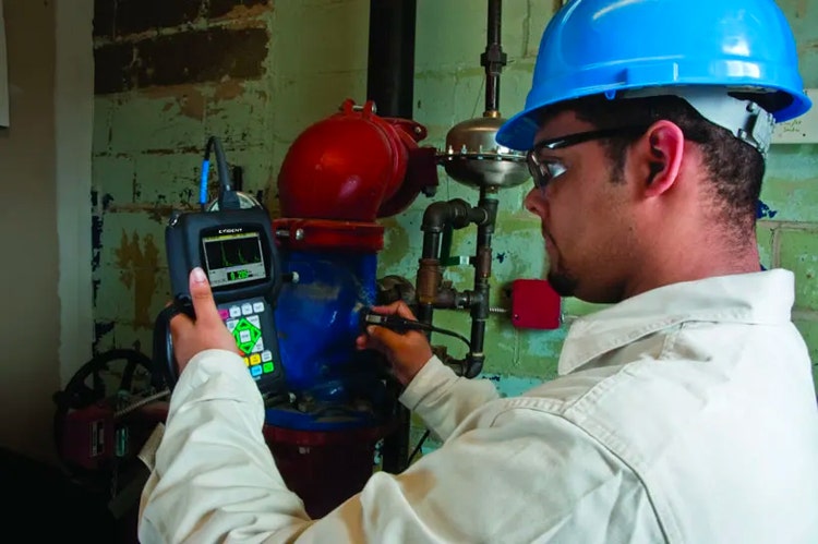 An inspector takes an ultrasonic thickness gauge measurement