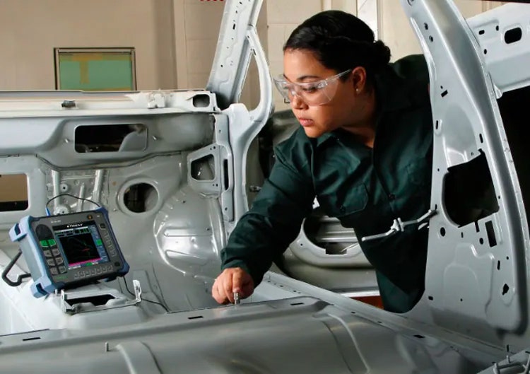 An inspector performs ultrasonic flaw detection in a factory setting