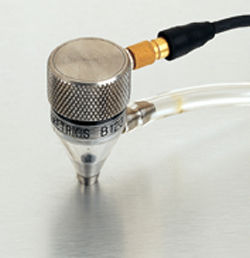 Handheld bubbler transducers are available in either 20 MHz (V316B) or 10 MHz (V312B). They are immersion transducers that screw onto a bubbler assembly (B120) which has a replaceable stainless steel tip and a water feed tube. They offer high resolution and easy access inspection of thin materials. The V316B and bubbler combination can resolve thicknesses down to 0.008" (0.2 mm).