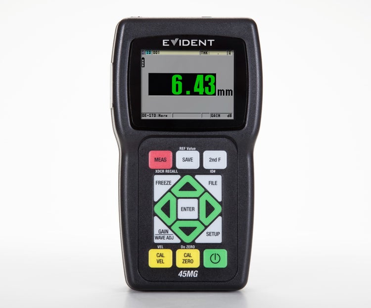 The 45MG is an advanced ultrasonic thickness gauge packed with standard measurement features and software options. This unique instrument is compatible with the complete range of Evident dual element and single element thickness gauge transducers, making this innovative instrument an all-in-one solution for virtually every thickness gauge application.