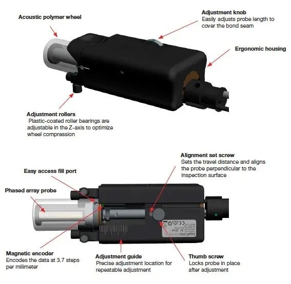 Para soportar las geometrías complejas y amplia variedad de piezas automotrices, Evident ha desarrollado la sonda de roldana Phased ArrayEdgeFORM™. La sonda de roldana EdgeFORM se acopla a los bordes de las piezas que presentan uniones adheridas. Tiene una longitud de apertura ajustable de 4 mm a 32 mm para adaptarse a geometrías complejas y ser capaz de monitorizar uniones adheridas mediante una representación C-scan fácil de interpretar.