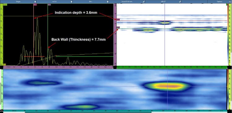 En esta aplicación, la capa adhesiva era lo suficientemente gruesa como para poder distinguir ambas interfaces. Al usar los cursores de medición en las representaciones S-scan y A-scan, se determinó que la capa formada por el adhesivo era de 15 mm (0,6 pulg.) de espesor.