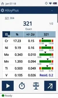 - Identificación integral de los grados (ley): La biblioteca de grados de serie incluye más de 600 grados de aleación exclusivos. La biblioteca de elementos residuales o «impurezas», basada en las normas industriales, simplifica la correspondencia de grados.