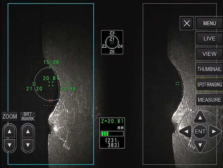 Al medir las distancias Z de todos los píxeles en la imagen estereoscópica, el videoscopio puede presentar ejemplos de estas distancias en tiempo real al mismo tiempo que resalta nada más y nada menos que cinco valores Z individuales en cada región de la imagen estereoscópica. Esto permite entender el perfil superficial y obtener más detalles para una medición en toda confianza.