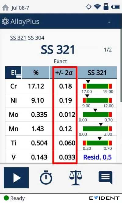 En este resultado de ensayo, que implica una aleación de acero inoxidable de 321, el analizador XRF Vanta calcula los resultados con 2 sigma.
