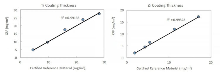 Los datos del gráfico evidencian la correlación entre los resultados obtenidos usando el analizador XRF portátil Vanta™ y los materiales de referencia para el espesor del revestimiento en titanio (Ti) y en circonio (Zr).