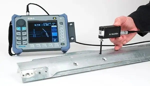 Inspección de la perforación de un remache con el detector de defectos NORTEC 600 y el escáner rotativo MiniMite
