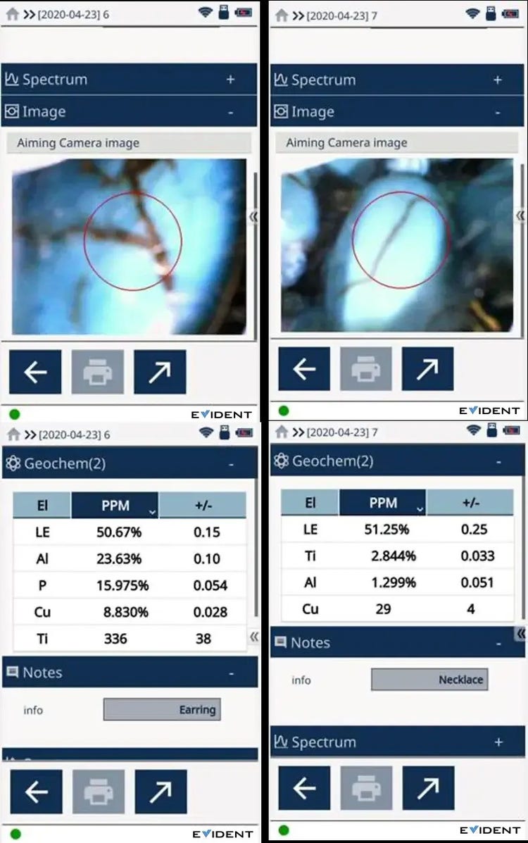 El analizador calculó el porcentaje de carbonato de calcio (CaCO3) de ambas piedras preciosas en un ensayo corto de 20 segundos. El resultado fue la identificación rápida de una perla verdadera y su imitación. A continuación, podrá echar un vistazo a las muestras y sus resultados: