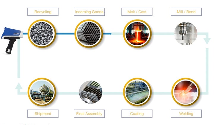 XRF-ul portabil ajută la prevenirea amestecurilor de materiale și a problemelor de trasbilitate prin identificarea nondistructivă a aliajelor. Analizoarele Vanta folosesc specificații chimice ale materialului pentru a identifica metalele și mărcile de aliaj. Analizoarele oferă o analiză rapidă și limite de detecție scăzute pentru elementele ușoare, cum ar fi aluminiul, fosforul și sulful, confirmând rapid compoziția chimică corectă a aliajului.
