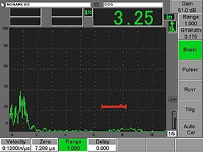 En el siguiente ejemplo, el sonido atraviesa una soldadura correcta sin generar un reflejo. Ningún defecto importante es visualizado en la pantalla. Sin embargo, una discontinuidad que se encuentra entre la zona de la soldadura puede causar una fuerte reflexión contra la zona de interés marcada por la puerta roja.