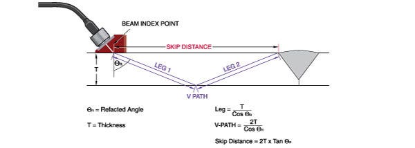 Las sondas de haz angular más utilizadas generan una onda transversal refractada con ángulos estandarizados de 45, 60 o 70 grados en el material bajo inspección. El ángulo de incidencia, necesario para producir un ángulo refractado deseado, se basa en la velocidad acústica del material y es calculado según ley de Snell que se formula en la siguiente ecuación.