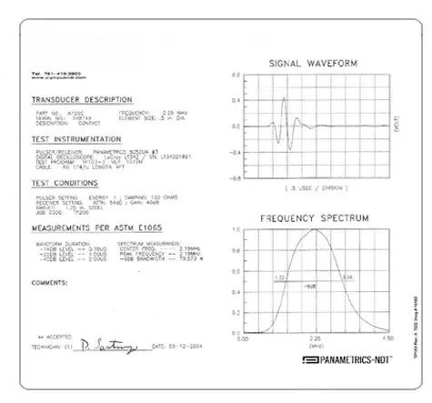 Las sondas de ultrasonido para ensayos no destructivos por lo general siguen la caracterización de sus fabricantes en conformidad con los procedimientos estándar de la industria (p. ej., ASTM E1065). Normalmente, la sensibilidad, la forma de onda y el espectro de frecuencia de la sonda serán evaluados y registrados en condiciones documentadas. A continuación, se muestra una forma típica de cómo se caracteriza una sonda.