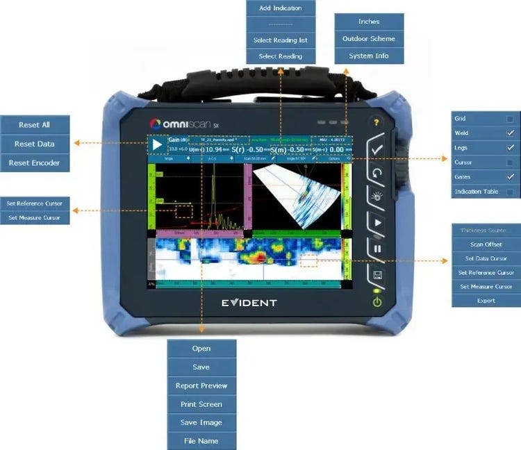 El OmniScan SX otorga una fácil configuración de los parámetros de inspección para escaneos manuales, unilineales o codificados por trama. La adquisición se muestra en tiempo real a través de diferentes vistas y favorece el almacenamiento de datos en una tarjeta SD, dotada de la capacidad de reemplazo en caliente, o en un dispositivo USB 2.0.