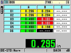 | Esta opción utiliza un único eco de fondo para medir el espesor real del metal. Además, es posible visualizar los espesores del metal y del revestimiento cuyos valores se encuentran ajustados con la velocidad de propagación acústica correcta. No hace falta decapar la pintura o retirar los revestimientos de las superficies. Las sondas duales D7906-SM, D7906‑RM, y D7908 emplean la tecnología THRU-COAT. |
