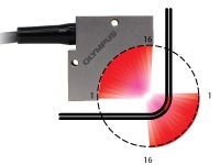 Notre solution d’inspection de rayon des composites par ultrasons multiéléments comprend des supports et des réseaux linéaires courbes couvrant le coin complet en un seul passe. La forme de la sonde permet à tous les faisceaux ultrasonores de s’aligner à angle droit avec la surface du coin, comme pour l’inspection d’une surface plate. Cette inspection de rayon est effectuée en immersion, de l’extérieur ou de l’intérieur du rayon, en fonction de sa forme et de sa taille.