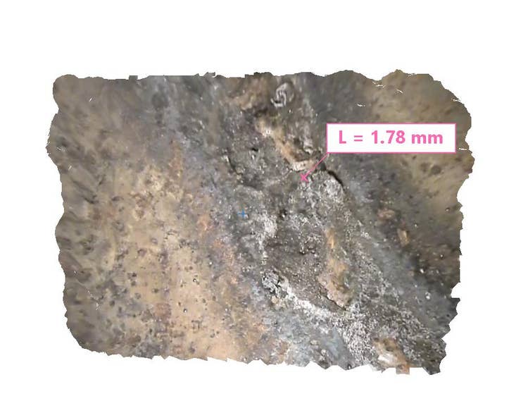 À gauche : modèle 3D de l’endommagement d’un tuyau. À droite : le même modèle avec l’analyse des dégradés de couleurs.