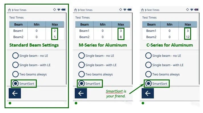 De nombreux alliages, comme l’aluminium, contiennent des éléments légers (du magnésium jusqu’au soufre) qui nécessitent une analyse plus longue avec un deuxième faisceau pour être détectés. Mais dans de nombreux cas, l’analyse des éléments légers n’est pas nécessaire pour identifier la nuance d’alliages. La fonction « SmartSort » allonge ou raccourcit automatiquement les durées d’analyse en fonction du matériau pour améliorer la productivité de l’utilisateur. Consultez ces exemples à titre de référence rapide :