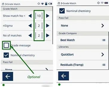 Assurez-vous d’utiliser une version de la bibliothèque de nuances « QuickSort » ainsi que la bibliothèque des éléments résiduels « Residuals (Tramp) ». La bibliothèque de nuances « QuickSort » contient plus de 500 des nuances d’alliages commerciales les plus courantes, optimisées pour vous offrir l’équivalence de nuances la plus rapide avec une séparation maximale des nuances. L’option « Grade message », qui affiche toute information supplémentaire sur la nuance, est facultative.