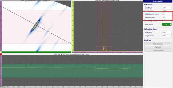 La valeur du diamètre du SDH (3 mm) est entrée dans le champ approprié de la fenêtre Beam Delay afin que la position de réflexion soit calculée avec précision et que la zone de tolérance (zone verte en bas de l’affichage des données) soit toujours conforme à la norme de 1 mm