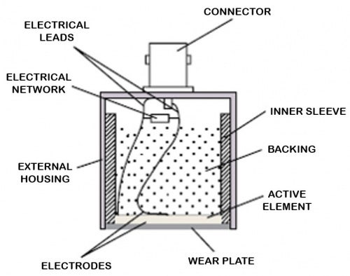 Les éléments en céramique de la sonde sont découpés selon une structure cristalline, laquelle se déforme de manière prévisible lorsqu’un courant électrique la traverse. La déformation répétée de la face cristalline crée une onde ultrasonore qui parcourt le matériau inspecté. La structure cristalline peut être orientée pour maximiser la déformation longitudinale ou transversale, ce qui permet donc de créer des ondes ultrasonores longitudinales ou transversales. L’épaisseur de l’élément piézoélectrique détermine la fréquence des ultrasons générés : les éléments cristallins plus épais génèrent des ultrasons à basse fréquence, tandis que les éléments cristallins plus fins génèrent des ultrasons à fréquence plus élevée.