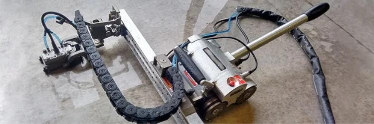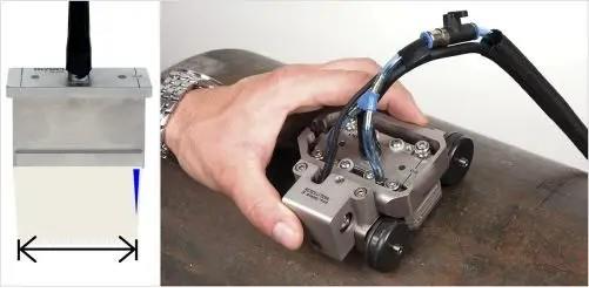 Dans cet exemple, un appareil de recherche de défauts par ultrasons multiéléments OmniScan® a été utilisé avec une sonde de 7,5 MHz à 64 éléments couplée à un scanner motorisé. Pour cette application, il était nécessaire que l’appareil ait la sensibilité nécessaire pour détecter des zones présentant un décollement de 5 mm. La sonde et le métal ont été couplés au moyen du concept de colonne d’eau, qui élimine le besoin d’utiliser un sabot (solution HydroFORM®). L’assemblage a ensuite été installé sur un support et intégré au bras du scanner.