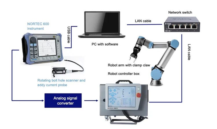 Comme le montre le schéma ci-dessous, il est possible de concevoir une solution qui intègre notre équipement à courants de Foucault et votre PC. Le PC contrôle l’appareil NORTEC, reçoit le signal de déclenchement d’alarme, et communique avec un robot/cobot (robot collaboratif) et contrôle ce dernier. Les systèmes existants que nous avons vus et qui sont dotés de cette solution comportent un bras robotisé qui est programmé pour tenir la sonde du scanner rotatif et pour l’insérer dans les trous de boulons des pièces défilant sur la ligne de production.