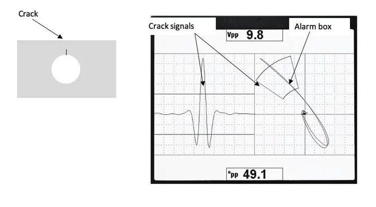 Lorsque la sonde à courants de Foucault détecte une fissure dans un trou de boulon, son impédance change et un signal apparaît sur le plan d’impédance ainsi que sur le diagramme filant de l’appareil à courants de Foucault. Une boîte d’alarme peut être configurée pour mettre en évidence des variations spécifiques du signal. L’appareil fournit les composants verticaux et horizontaux du signal au moyen des sorties analogiques sur le connecteur d’entrées et de sorties.