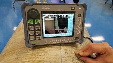 Evidence of corrosion: the flaw detector is showing the minimal remaining wall thickness in this area is only 0.251 in.