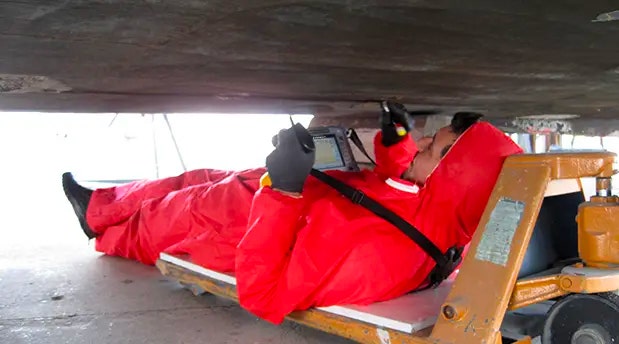 Les bateaux sont régulièrement soulevés hors de l’eau pour permettre d’en inspecter la coque de l’extérieur, que ce soit pour une inspection visuelle ou par percussion. Cependant, les matériaux de remplissage, les revêtements et les couches de peinture sur l’extérieur de la coque peuvent complexifier l’inspection visuelle.