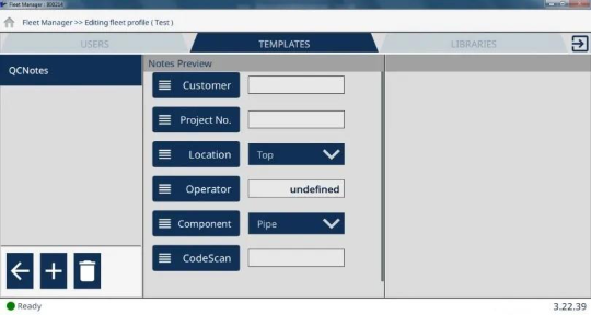 Avant de pouvoir utiliser la fonction de lecture des codes à barres, vous devez d’abord créer sur votre ordinateur un modèle de notes contenant un champ pour recevoir le code à barres et déployer ensuite ce modèle sur l’analyseur Vanta. La création d’un modèle de notes personnalisé s’effectue à partir de la section du logiciel Vanta PC utilisée pour la gestion de votre parc d’appareils. Pour plus de détails, consultez ces tutoriels vidéo sur la façon d’utiliser la fonction de gestion du parc d’appareils et de création d’un modèle de notes.
